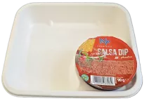 Biodegradowalna tacka z komorą na sos wykonana z naturalnej trzciny cukrowej to doskonała alternatywa dla plastikowych opakowań. Dzięki osobnej przestrzeni na dip, tacka idealnie nadaje się do nachosów, frytek, przekąsek i dań street food. Tacka jest odporna na działanie wysokich i niskich temperatur, w pełni kompostowalna i przyjazna środowisku.